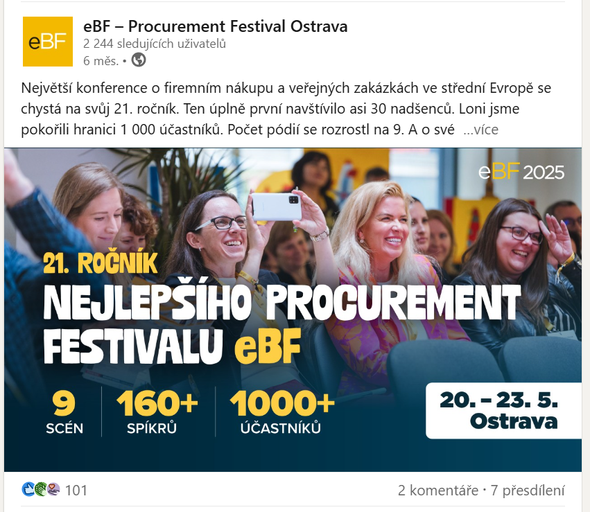 Skvěle se osvědčil například náš carousel o festivalu eBF 2025, který na LinkedInu informoval o programu a účastnících akce.